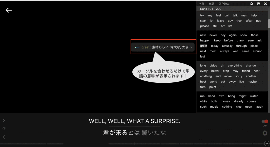 「今なんて言ったんだろう?」と毎回字幕設定を日本語/英語で切り替えて巻き戻しをして、単語の意味を調べて・・・の繰り返しをしていたことを考えると、まさに 「英語学習の革命ツール」 と言えるレベルです。